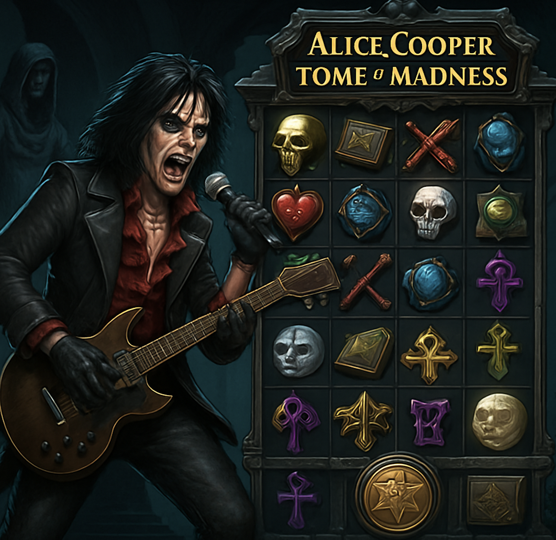 Alice Cooper and the Tome of Madness är Play’n GO:s verk. Det fortsätter tillverkarens framgångsrika rockserie, som inkluderar bland annat Sabaton, Annihilator och Twisted Sister. Det Svensks alltså ingen anledning att tro att det nya spelet inte skulle nå samma nivå som tidigare produktioner.