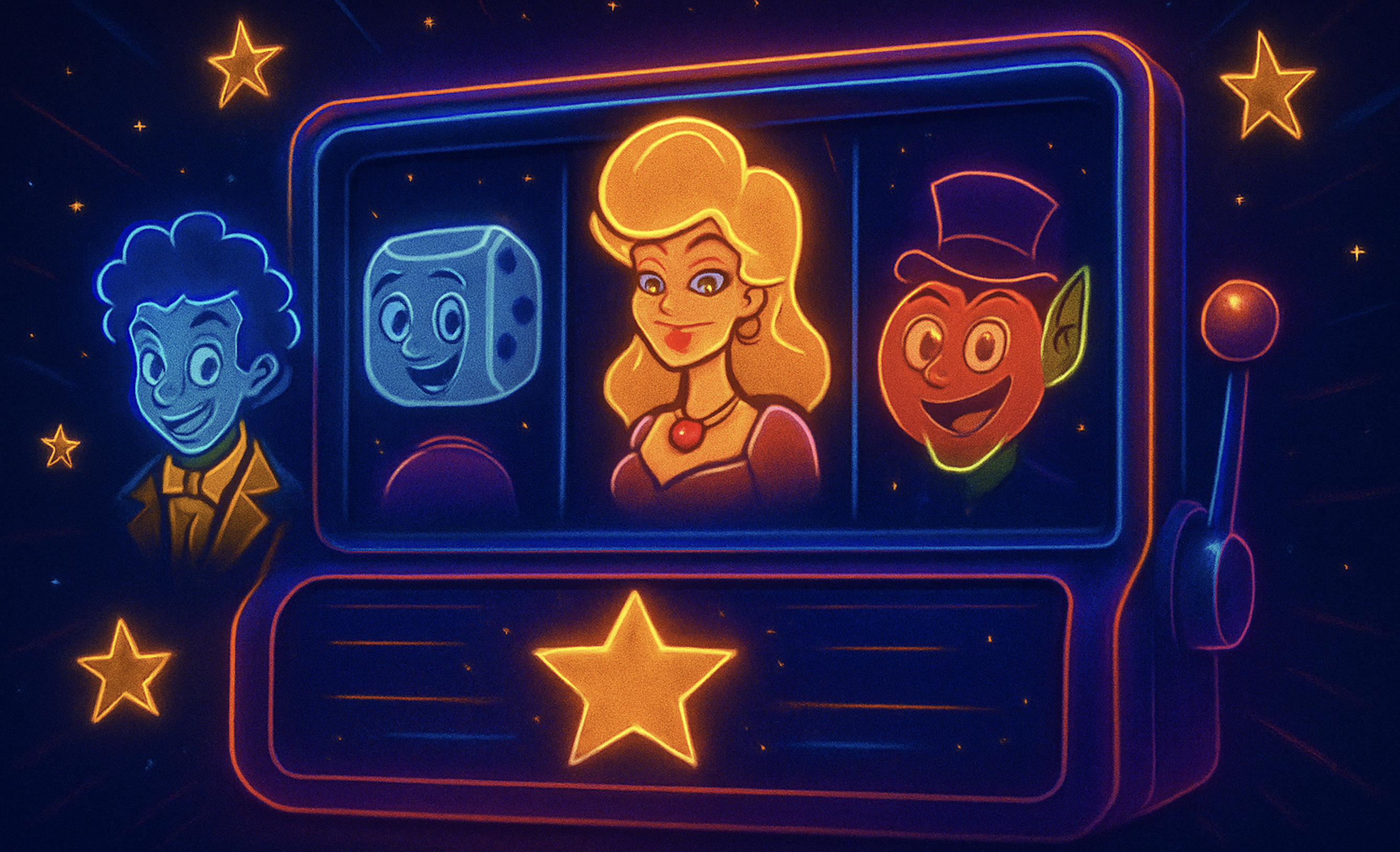 Spelföretagets egna superstars pryder slotten, som ser ut som om du spelar på ett gammalt klassiskt brädspel. Ljudlandskapet ger extra underhållning och varje karaktär som dyker upp då och då har sina egna musikstycken och utrop, vilket gör att man ibland kan le åt spelet. Vad kan vara roligare än ett välgjort spel som man helt kan fördjupa sig i, där små detaljer får skrattmusklerna att kittla! Karaktärernas egen stil har integrerats i Superstars-temat. Detta extra element ökar spelupplevelsen.